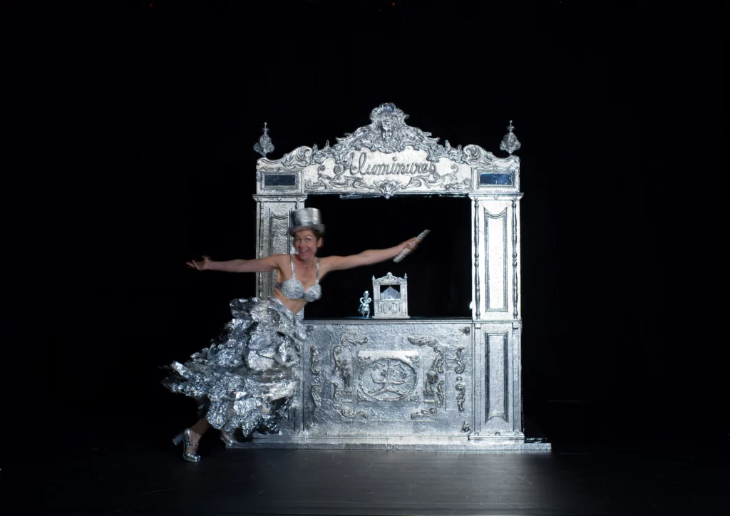 Dans « Aluminures » dérisoire et clinquant, le rouleau d’aluminium de votre cuisine se déroule et se dresse en orgue de barbarie baroque, devient théâtre, rideau de scène, acteur éphémère, brillant des mille feux de la fête, dansant, chantant, s’offrant en miroir pour vous séduire. Que la fête commence!